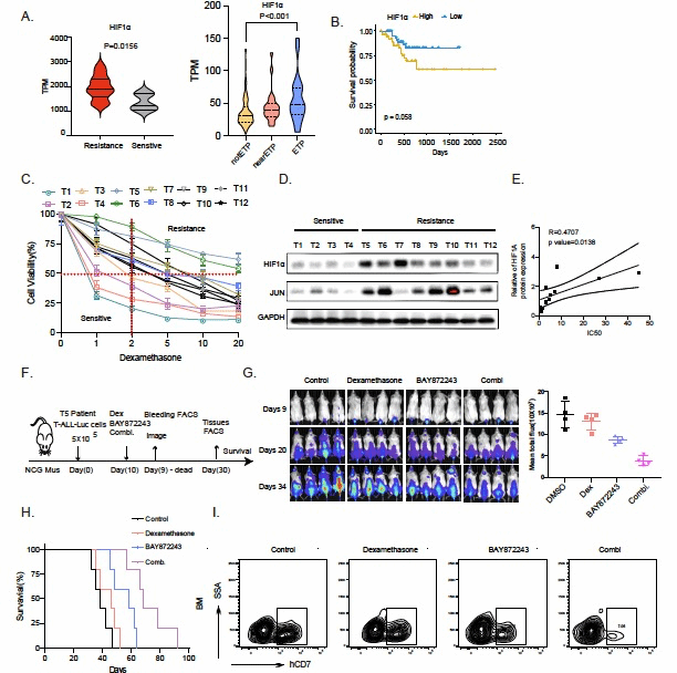 地塞米松是一种广泛应用于急性淋巴细胞白血病的抗炎药物,其耐药是T-ALL复发主要原因之一。此项研究中,研究团队通过对地塞米松耐药和敏感的T-ALL病人数据分析发现转录因子JUN在地塞米松耐药T-ALL患者样本中表达上调,且与患者预后呈负相关。通过构建T-ALL地塞米松耐药细胞系并对其进行RNA-seq和ATAC-seq测序证明JUN的表达受JNK信号通路的调控。 靶向JNK信号通路可以有效的逆转耐药。随后利用药物高通量筛选进一步分析发现,JUN高表达导致的耐药是通过与转录因子HIF1A结合并抑制其与常氧状态下的降解来实现。HIF1A抑制剂与地塞米松协同作用,增强地塞米松耐药细胞(人T-ALL细胞)体外和体内的细胞死亡,这一结论在T-ALL细胞系和临床样本中得到验证。