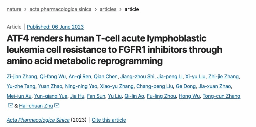 6月9日,我院张同存教授/祝海川副教授课题组在Acta Pharmacologica Sinica(中科院一区, 药学Top期刊)杂志上,发表题目为“ATF4 renders human T-cell acute lymphoblastic leukemia cell resistance to FGFR1 inhibitors through amino acid metabolic reprogramming”的研究论文。