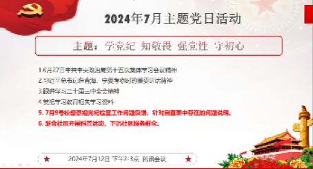 此外,教工党支部纪检委员王聪聪同志就7月9号学校党纪学习教育督导组关于党纪检查工作中的问题进行了反馈,强调全体教工支部党员必须严格对照《中国共产党纪律处分条例》进行自查并整改,做到学纪、知纪、明纪、守纪。